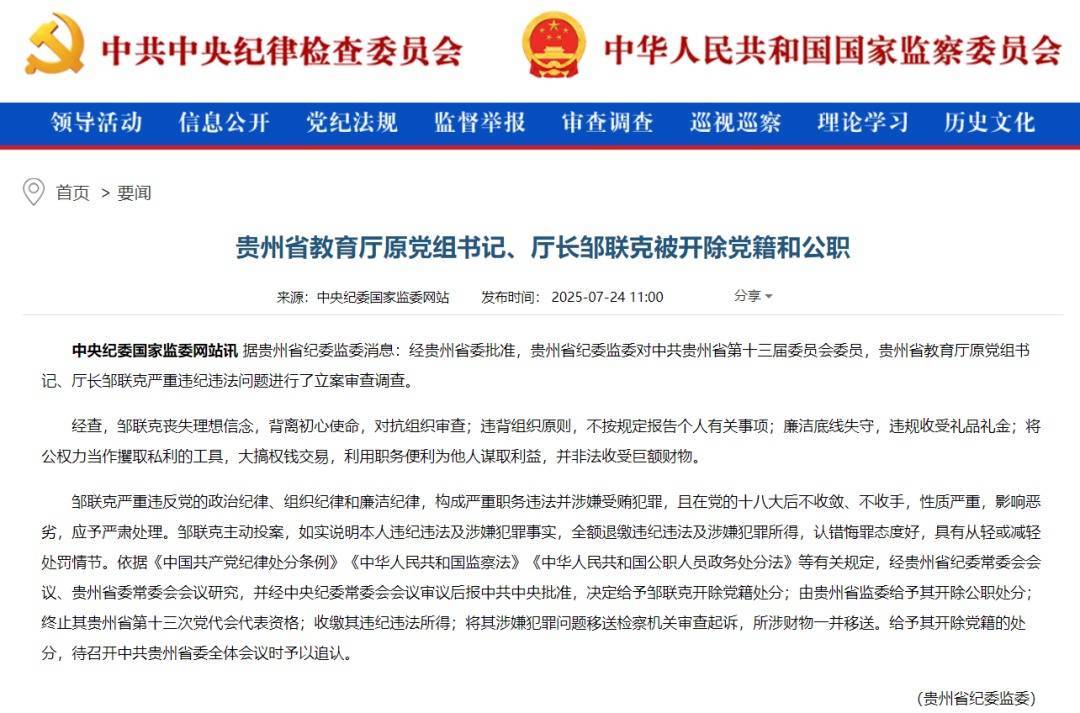 据贵州省纪委监委2025年7月24日消息:经贵州省委批准,贵州省纪委监委对中共贵州省第十三届委员会委员,贵州省教育厅原党组书记、厅长邹联克严重违纪违法问题进行了立案审查调查。